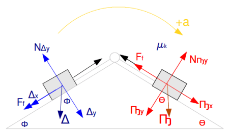 Para obtener de golpe la aceleración, lo único que necesitamos son los coeficientes de fricción, las masas y los ángulos de las rampas. (para obtener el ángulo entre nuestro vector peso y nuestro vector perpendicular al plano del movimiento. La formula nos dice que es la sumatoria de todas las fuerzas que existan en la dirección del movimiento, en este caso las únicas fuerzas involucradas son fuerzas de fricción y la componente del peso en el movimiento (que por lo regular es el mismo plano, a menos que en ese segmento se encuentre colgando… en ese caso la dirección del movimiento es vertical y no hay plano… todo el peso estaría sobre nuestra linea imaginaria del movimiento.) La razón por la cual podemos omitir todas las tensiones te la voy a dejar al aire, para que te entretengas en el ¿Por que?