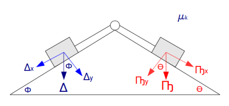o que yo hago es una simplificación del diagrama, en donde omito la mayor parte de las componentes…  principalmente las tensiones ya que al utilizar a mi manera la misma formula (o cuando menos el mismo concepto), donde ya no es aplicable a X o Y es en dirección del movimiento, sin importar cuantos cambios de direcciones tenga… es como si tomaras el extremo izquierdo del sistema y extremo derecho con las manos y le «estiraras» creando una sola linea de acción. Tomando como positivo todo aquello en dirección de la aceleración (que también debemos de suponer) si la aceleración nos queda negativa simplemente quiere decir que va en sentido contrario a lo que hemos supuesto.
