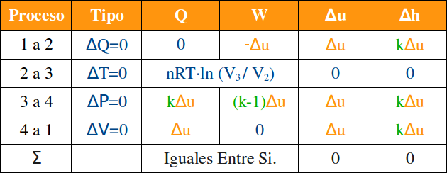 Siendo aun mas simple ya que con este dato que obtenemos (en cálculos de volúmenes, temperaturas y presiones anteriores cuando ocurre un adiabático de no ser así hay que obtenerle) la relación entre la energía interna y la entalpía. Donde para la tabla y con un poco de álgebra básica podrás demostrar que cuando sustituimos las diferentes variaciones del proceso (exceptuando isobarico donde Q=∆h) en la formula general para este tema: Q- W = ∆u la siguiente tabla. Quedando todo en funcion de ∆u y K. (Exceptuando desde luego el isotérmico, donde recomiendo utilices una R que haga compatibles las unidades con el resto de la tabla o que trabajes un poco en tus conversiones.