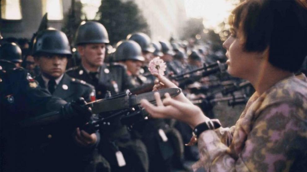 Me acordé de esa fotografía con el comentario de la publicación que vi «regalando flores». La foto fué tomada por Marc Riboud, junto con otras más, en octubre de 1067 durante las protestas contra la guerra en Vietnam, la joven Jan Rose Kasmir (de 17 años) se enfrenta con una flor a soldados armados con bayonetas ante el Pentágono de los EE UU. ¿Cuál debiera de ser el plan estrategía para cambiar la cultura en curso?
