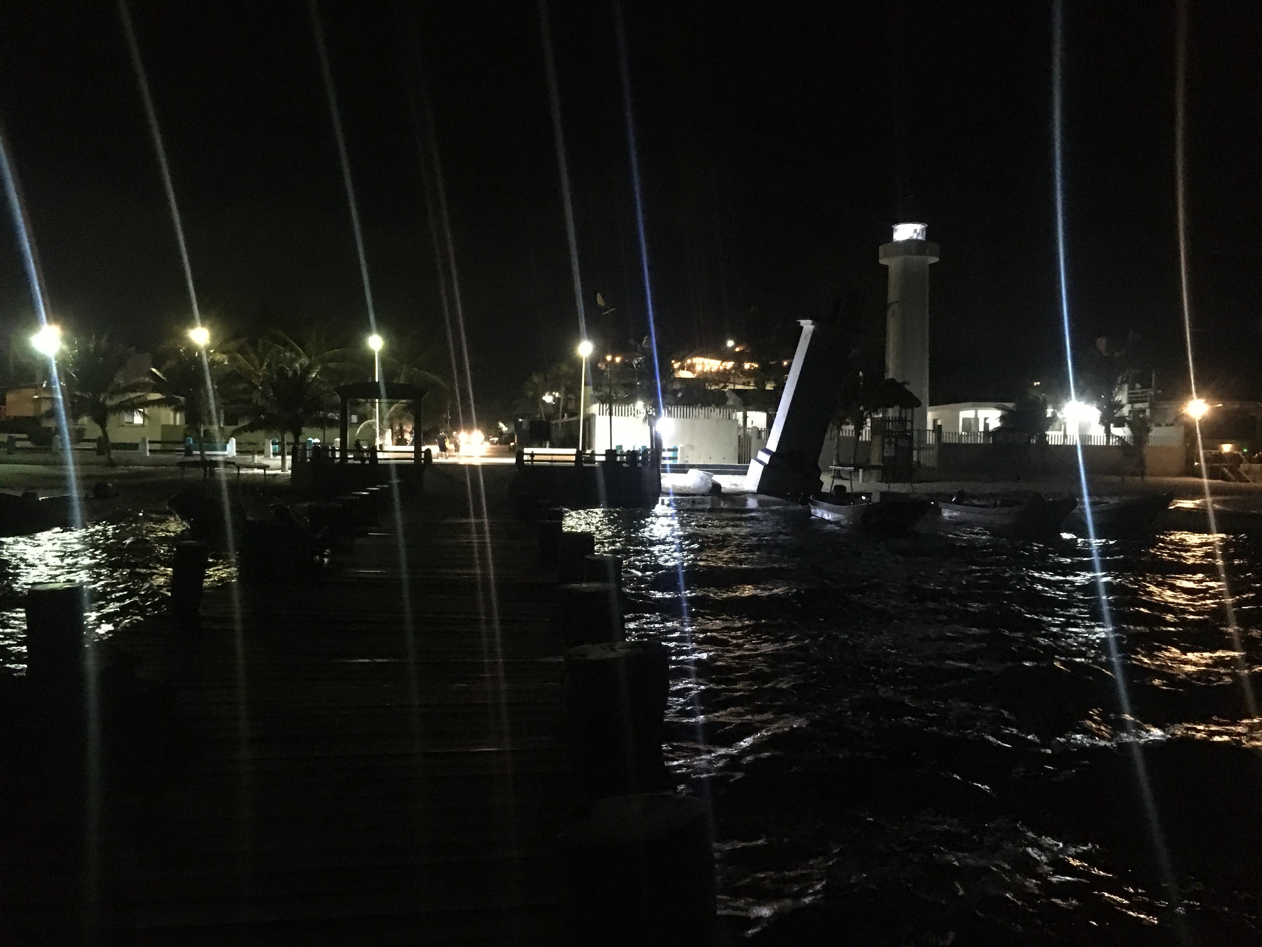Después de la cancha, cruzando la calle, hay otra explanada que da con el mar. En puerto, hay tres muelles. De izquierda a derecha, el primero es el más antiguo. Este, donde inicia, tiene un faro que un huracán (me parece) dejó inclinado como la torre de Pisa. Se ha convertido en algo icónico del pueblo. Afortunadamente para las embarcaciones ya hay otro, mas reciente, que sustituye en funcionalidad al antiguo.